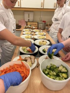 - Dag 4: Fokus på sjømat og tradisjonelle rettar. Dei laga fiskekaker, suppebollar, dampa blåskjel og renska kamskjell og scampi til fiskesuppe. I tillegg vart kål gjort klar til surkål og mykje forarbeid gjort til restaurantkvelden.