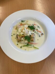Krema fiskesuppe med purreløk, gulrot, sellerirot, blåskjel, kamskjell og scampi.